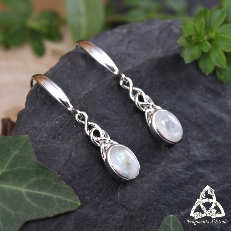 Les boucles d’oreilles Lúmena sont inspirées de l’esthétique celtique et de la finesse des bijoux elfiques. Léger et gracieux, leur design associe des entrelacs d’argent 925 à deux cabochons en Péristérite, aussi appelée Pierre de Lune arc-en-ciel blanche.