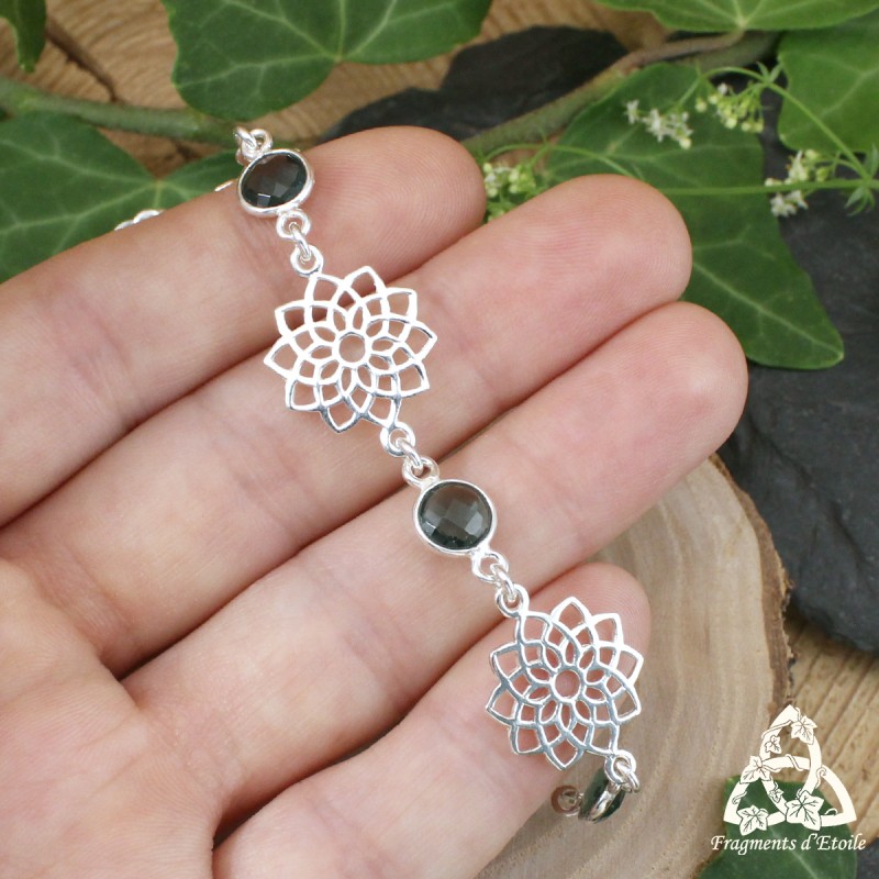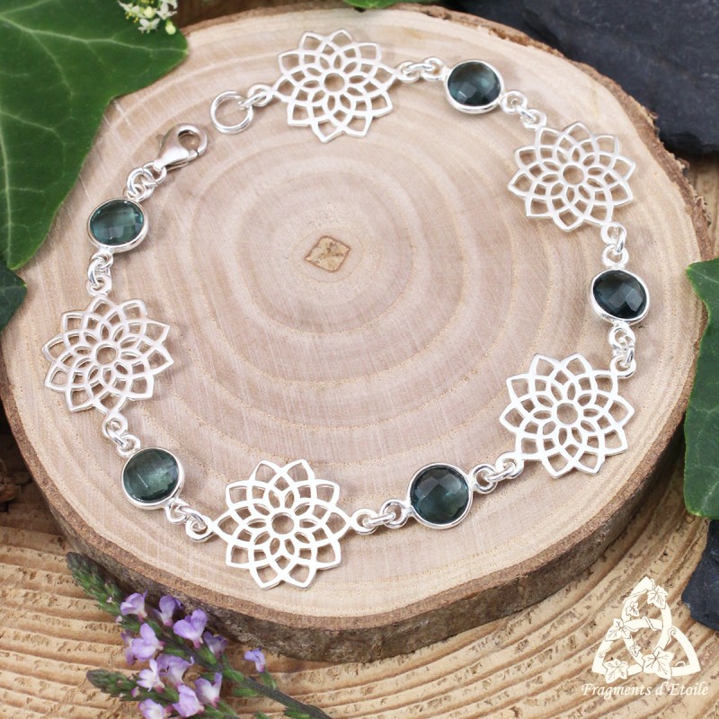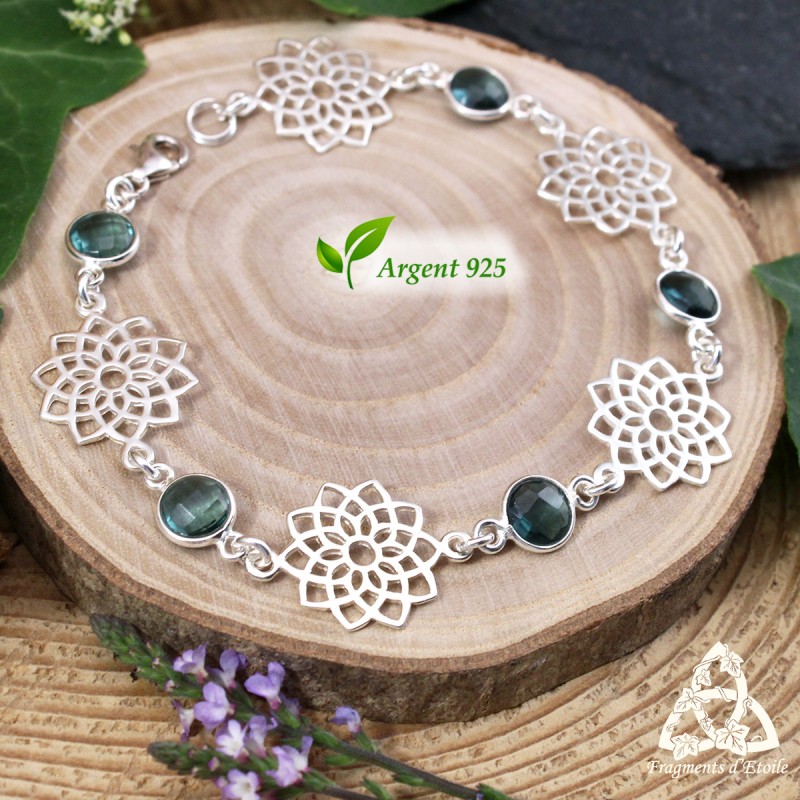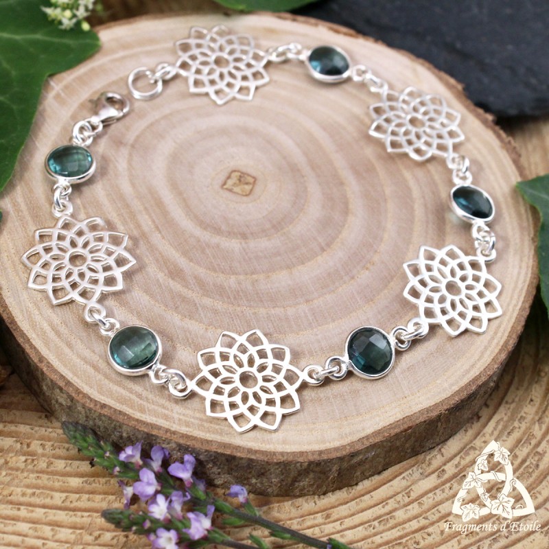 Lumineux et féerique, ce bracelet en argent 925 unit la beauté de la Topaze bleue à la symbolique de la fleur de vie.